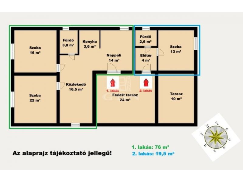 Az elrendezés PRAKTIKUS és RUGALMAS: az ingatlan két, egymástól elkülönülő egységre tagolódik. Egy külön, 19,6 m2-es ELSZEPARÁLT SZOBA saját FÜRDŐSZOBÁVAL rendelkezik, ennek fűtését INVERTERES KLÍMA adja. Emellett található egy 75,9 m2-es lakótér, amely 2 SZOBÁBÓL, NAPPALIBÓL, FÜRDŐSZOBÁBÓL, ELŐTÉR–ÉTKEZŐBŐL és KONYHÁBÓL áll. Ez a kialakítás sokféle használati módot támogat, és jól átlátható.