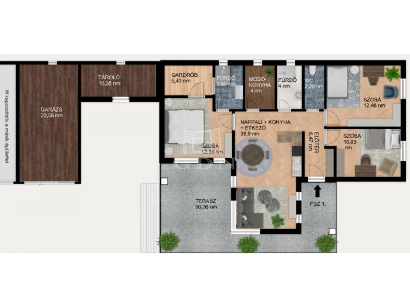 Szülői hálószoba saját gardróbszobával, valamint különálló zuhanyzós fürdőszobával és WC-vel, biztosítva a teljes privát szférát.