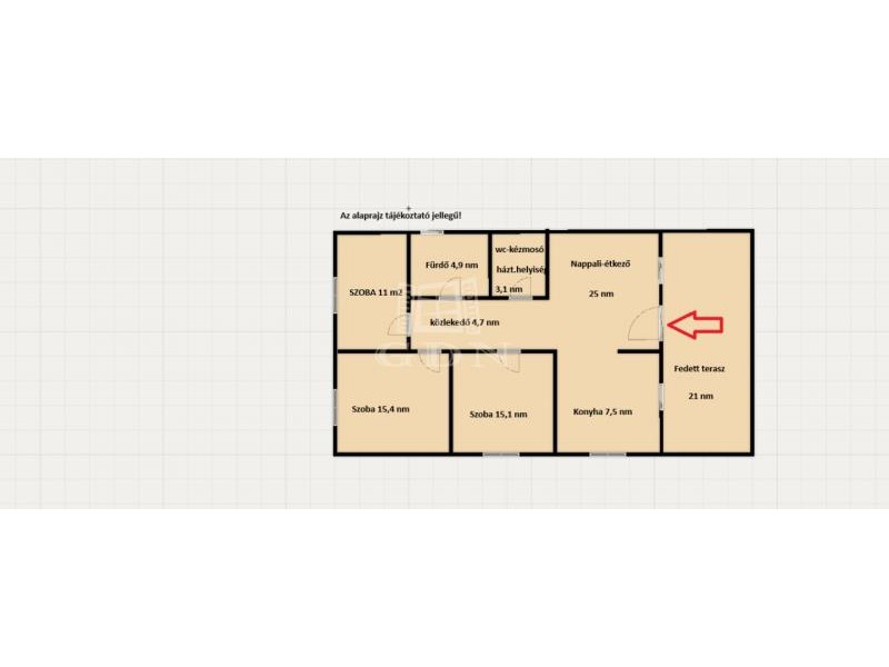 Ezenkívül egy félfallal elválasztott 7,4 nm-es konyha, 3 szoba