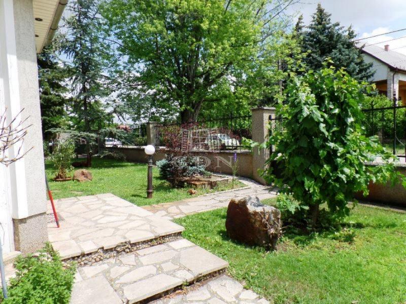 Az öntözőrendszerrel kiépített, parkosított és terméskővel burkolt udvar több autó parkolására alkalmas. A rendezett telken téglából épült 20 m2 garázs és 16 m2 fedett terasz is található.