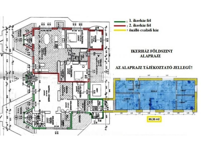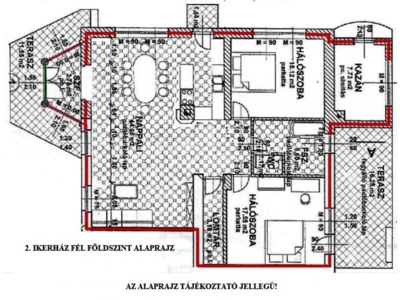 Ingatlan elosztása (két szinten – 160 m2): nappali+étkező+konyha, 4 szoba, 2 fürdő, 2 wc, előtér, tároló, kazánház, terasz (16 m2)