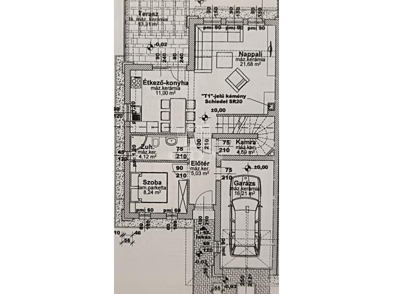 földszint: amerikai konyhás nappali, spájz, hálószoba, fürdőszoba mosdóval, közlekedő, garázs.