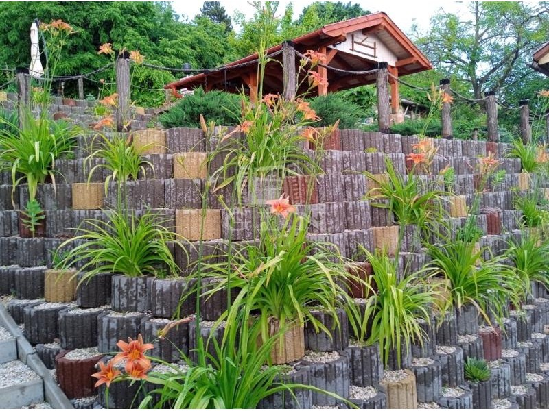 A lejtős telek lépcsőzetes kialakítást kapott. Ennek köszönhetően, különböző szinteken vízszintes felületek kerültek kialakításra.