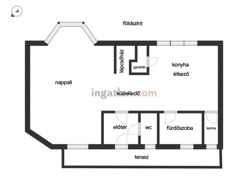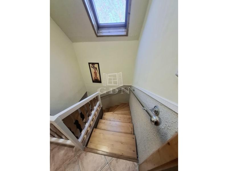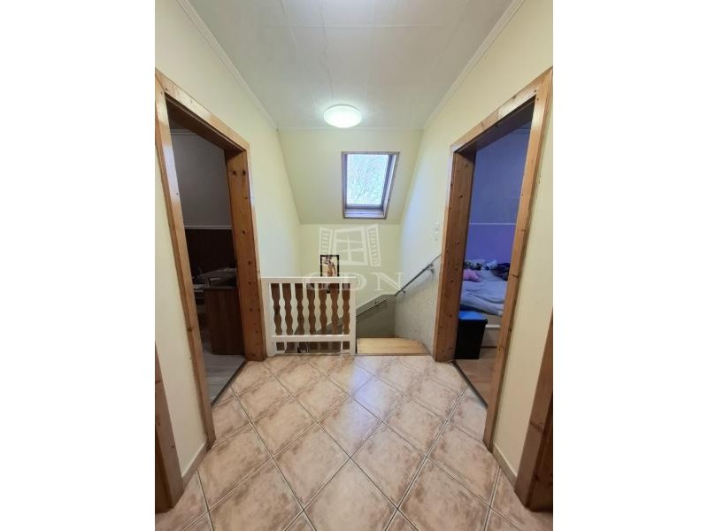 Helyiségei: földszinten előtér, nappali, konyha/étkező, kamra, zuhanyzós fürdőszoba, közlekedő, lépcső alatt gardrób wc.