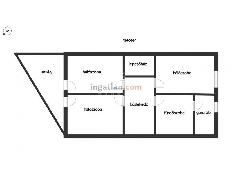tetőtérben: három külön bejáratú hálószoba ebből kettő erkélyes, fürdőszoba sarokkáddal, gardrób, közlekedő dolgozó sarokkal.