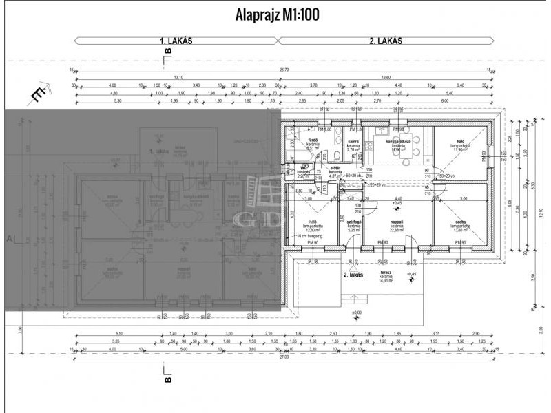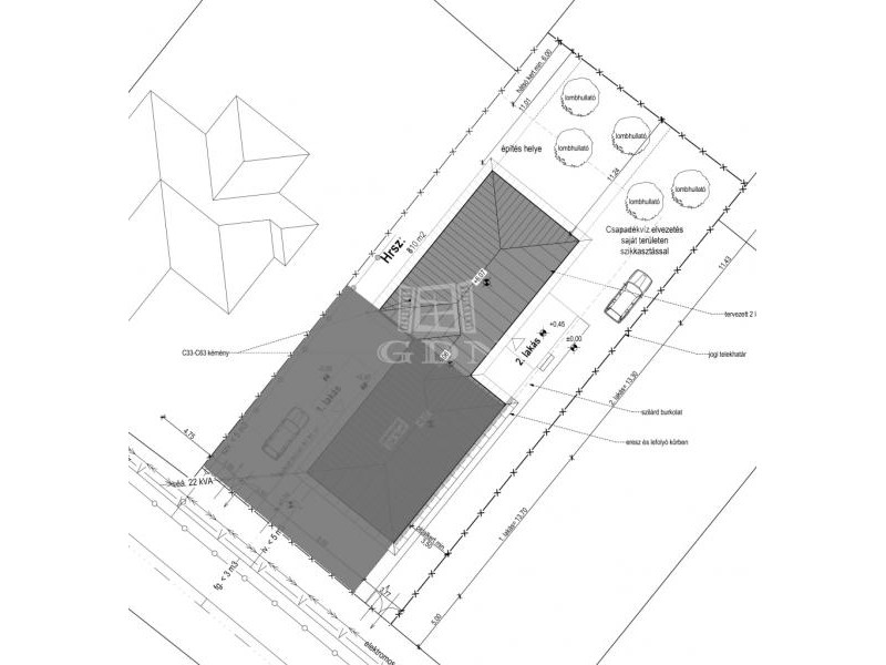 A ház egy 810 m²-es telekre épült, a társasházi alapító okirat révén a két lakóegység külön helyrajzi számon szerepel. Az eladásra kínált hátsó lakrész teljesen elszeparált, így a nyugalom és a privát tér garantált.