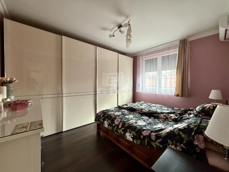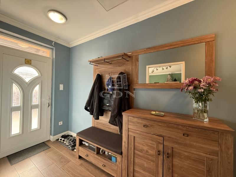 A 35 m²-es garázs két autó kényelmes tárolására alkalmas, a térkövezett kocsibeálló, valamint az öntözőrendszerrel ellátott kert tovább növeli a komfortérzetet.