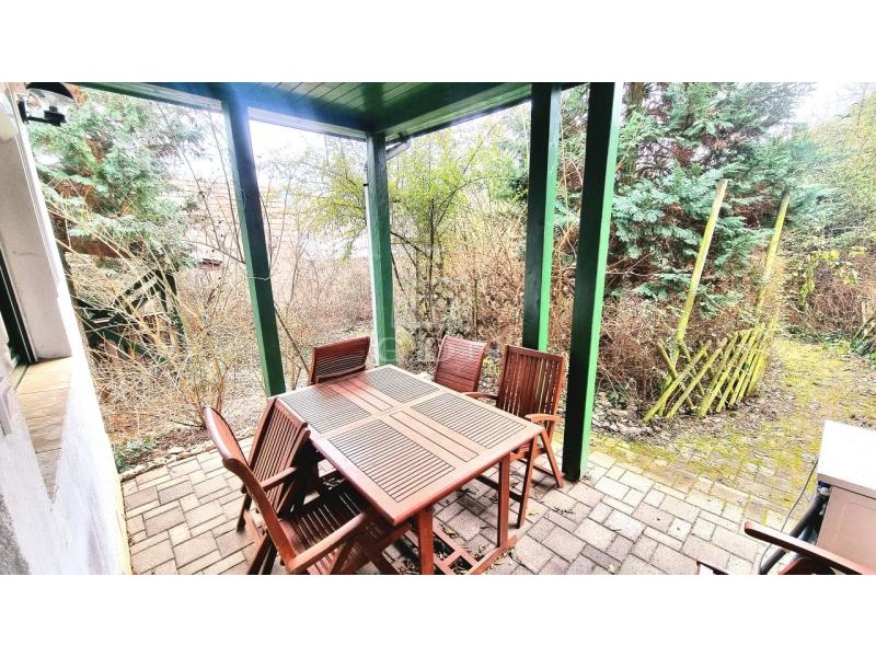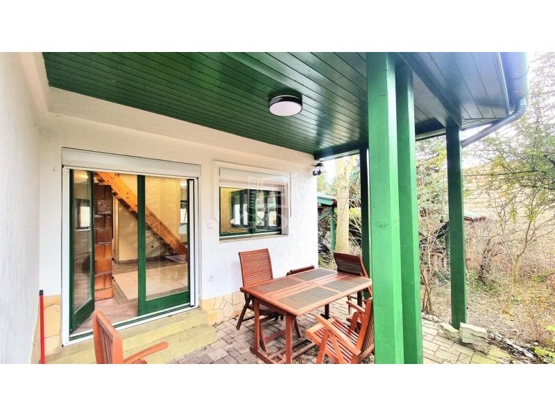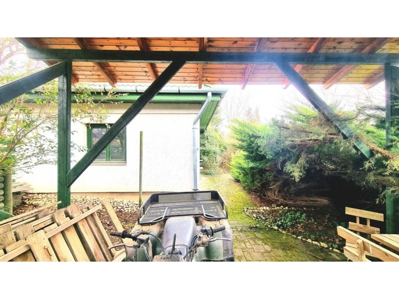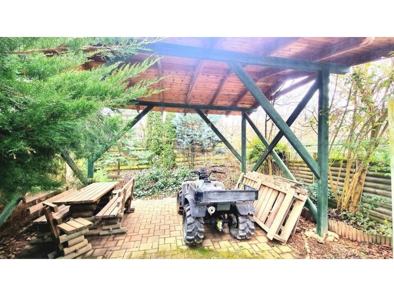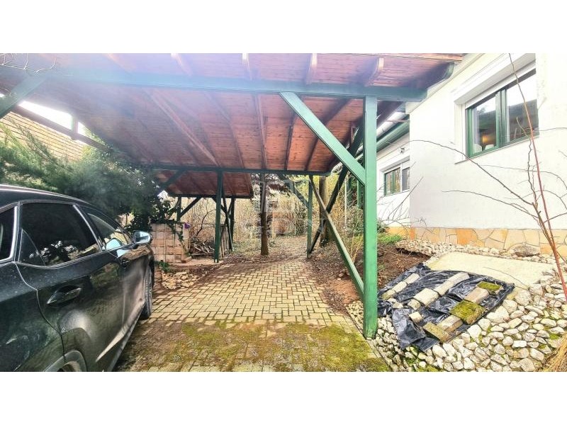 A 800 nm-es gondozott, vadregényes ,intim telken grillező terasz és e fedett kocsibeálló lett kialakítva.