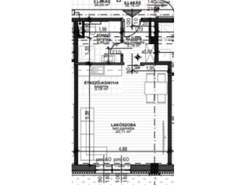 A lakás 35,16 nm, helyiségei:előtér 3,78 nm, fürdőszoba 4,89 nm, étkező/konyha 10,17 nm, nappali/lakószoba 16,32 nm.