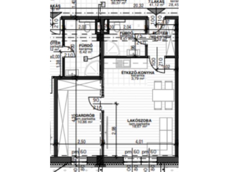 A lakás 41,12 nm, helyiségei:előtér 3,22 nm, fürdőszoba 4,52 nm, gardrób/szoba 10,84 nm, étkező/konyha 6,23 nm, nappali/lakószoba 16,24 nm.