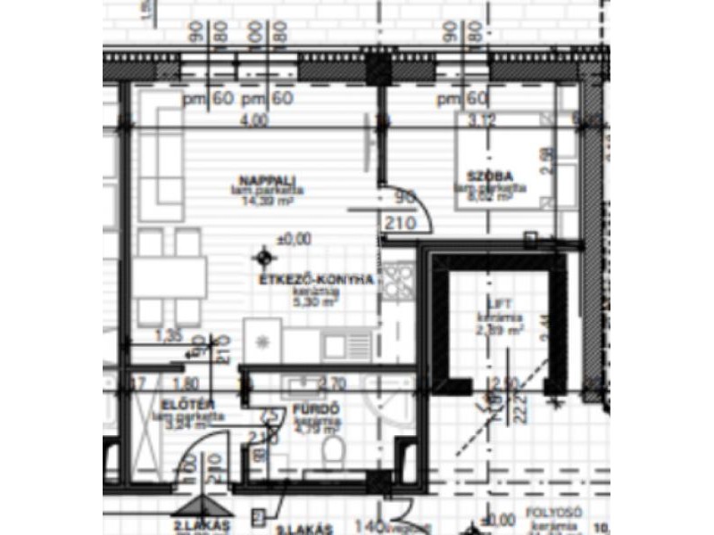 A feltüntetett ár földszint 2-es lakásra vonatkozik, 39 m2 lakótér, helyiségei: amerikai konyhás nappali, szoba, előtér, fürdőszoba.
