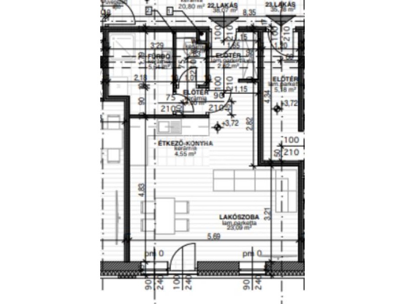 A lakás 38,07 nm, helyiségei:előtér 2,62 nm, fürdőszoba 5,75nm, lakószoba 18,46 nm, étkező/konyha 5,18 nm, előtér 1,00 nm wc 1,08 nm.