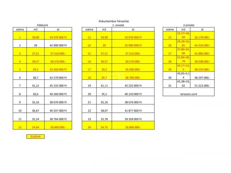 Kiskunlacháza központi részén, kínálom megvételre új-építésű 31 lakásos liftes társas-ház, második emeleti 43,38 nm-es lakását, 19,08 nm terasszal! Kiskunlacházán most épülő társas-ház második emelet 31-es. teraszos lakása eladó! A társas-házban 31 db lakás épül 27 és 54 nm között három szinten, lakások 2025 év végén kerülnek átadásra. Nézze meg a többi lakást is a hirdetésem között! Műszaki tartalom: -alap vasalt beton, -falazat phorothetm tégla -monolit beton födém -nyílászáró 3rtg üvegezett műanyag szerkezetű -tető fedése beton cserép -fűtés hőszivattyú, padlófűtés hőleadással -15 cm Dryvit rendszerű homlokzatszigetelés -választható hideg és meleg burkolat. A lakás nettó 43,38 nm, helyiségei:előtér 4,43 nm, fürdőszoba 7,46 nm, étkező/konyha 5,11 nm, nappali/lakószoba 18,48 nm, szoba 8,11 nm, terasz 19,02 nm. A lakáshoz vásárolható teremgarázshely melynek ára 3.500.000 ft, vagy földfelszíni parkolóhely melynek ára 1.500.000 ft, (megvásárlása nem kötelező), valamint tároló helyiség is vásárolható. A társas-házban 31 db lakás kerül megépítésre, a földszinti és első emeleti lakások erkély nélküliek, a 2 emeleti lakások terasz kapcsolattal rendelkeznek. Amennyiben kérdése merül fel, vagy megtekintené a lakást keressen bizalommal! FINANSZÍROZÁS: Nálunk mindent egy helyen intézhet: - hivatalos ingatlanközvetítés; - szakszerű jogi képviselet; - profi CSOK-PLUSZ, és hitelügyintézés: 16 Bank, több mint 100 konstrukció; A részletes adatvédelmi tájékoztató folyamatosan elérhető a gdn-ingatlan adatvedelmi oldalon.