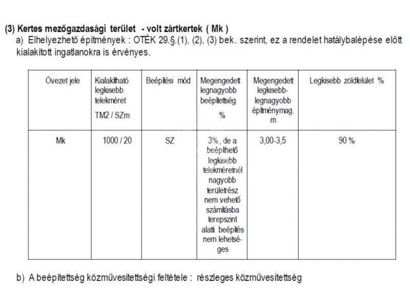 A telek Mk (kertes mezőgazdasági) építési övezetbe tartozik, ahol: