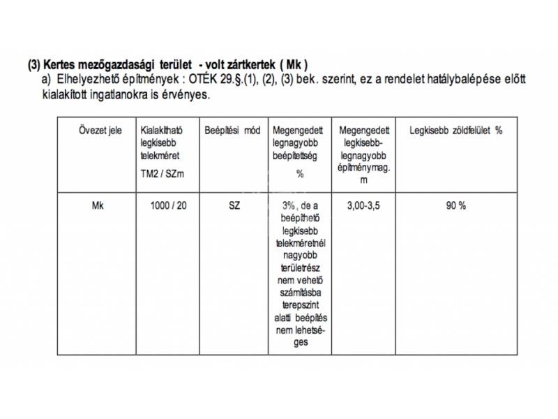 -a legnagyobb megengedett beépítettség 3%, de a beépíthető legkisebb telekméretnél nagyobb területrész nem vehető számításba, terepszint alatti beépítés nem lehetséges, ami ezen az MK területen max 1000 m2.