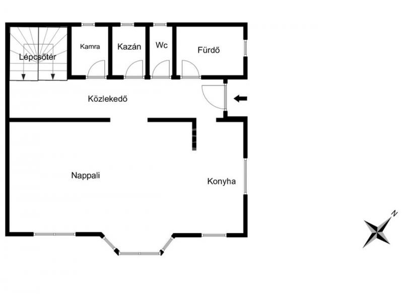 A földszinten egy tágas, amerikai konyhás nappali kapott helyet, amely a családi élet központja lehet. Innen nyílik egy praktikus kamra, valamint egy fürdőszoba, külön WC és háztartási helyiség, amelyek a mindennapi kényelmet szolgálják.