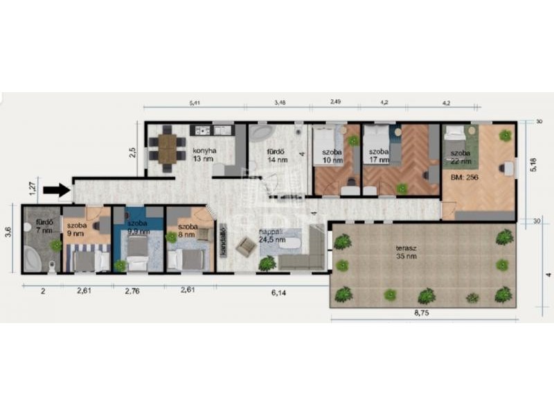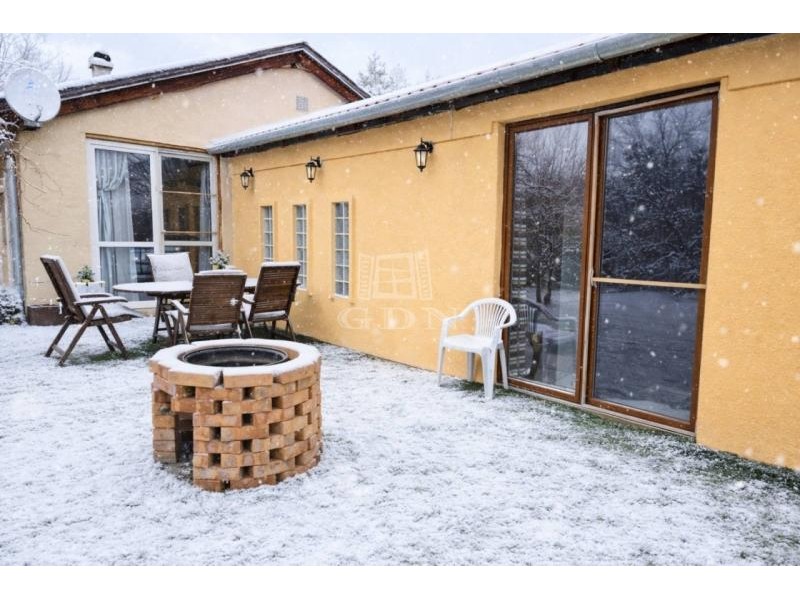Hatalmas, nem fedett terasz közvetlenül a nappaliból és az egyik szobából megközelíthető, ahonnan egy lépés a kert.