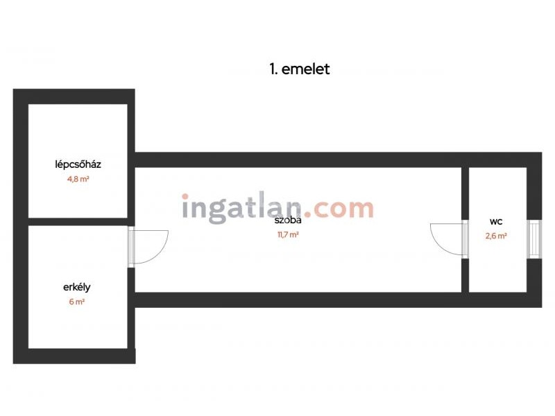 A lépcsőházból a felső szintre érkezve egy 6 m²-es erkélyen találjuk magunkat. A tetőtér 11,5 m²-es szobája erről az erkélyről nyílik. Ehhez az emeleti szobához a szoba végéből nyílóan tartozik egy mellékhelyiség (WC+kézmosó) is.
