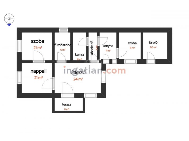 Helyiségek: fedett terasz, étkező-konyha, nappali, hálószoba, fürdő+WC, spejz kombinálva mosókonyha résszel, közlekedő, vendégkonyha, vendégszoba.