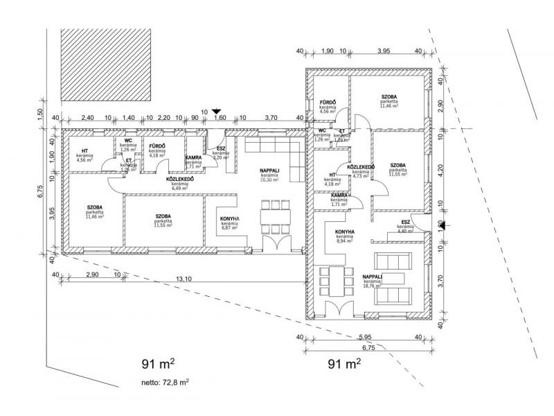 2.lakás: bruttó 91 nm, nettó 72,8 nm + 6 nm terasz