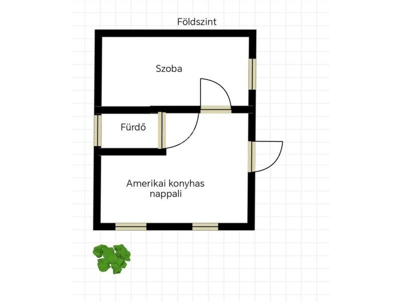 Földszint: előtér, amerikai konyhás nappali, hálószoba, fürdőszoba wc-vel.