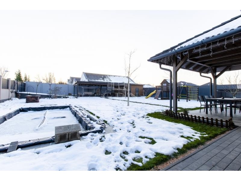 A 880 nm-es területet két elektromos nagykapun keresztül közelíthetjük meg autóval két utcáról, az egyik beálló a garázsba, míg a másik beálló a fedett beállóhoz biztosít bejutást. Udvaron található egy 80 nm-es fedett terület, melyből 25 nm hátsó grillező terasz vagy fedett beálló, a maradék épület Finn szauna, illetve tároló. Tervezésnél gondoltak a nyári hőség elviseléséhez, egy 3x6 méteres medencére komplett gépészettel, hőszivattyúval, külön játszótérre a gyerekeknek, illetve egy csepegtető rendszerrel ellátott 6 nm-es Leier magaságyásra is. Az udvar szépségéért öntözőrendszer felel amit fúrt kút táplál, a kényelemért pedig egy robot fűnyíró dolgozik.