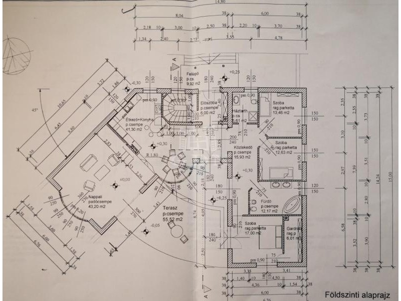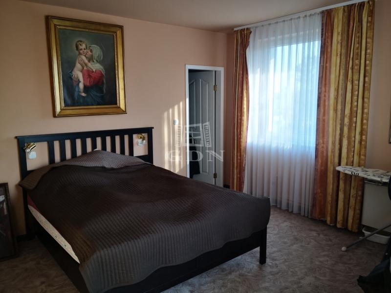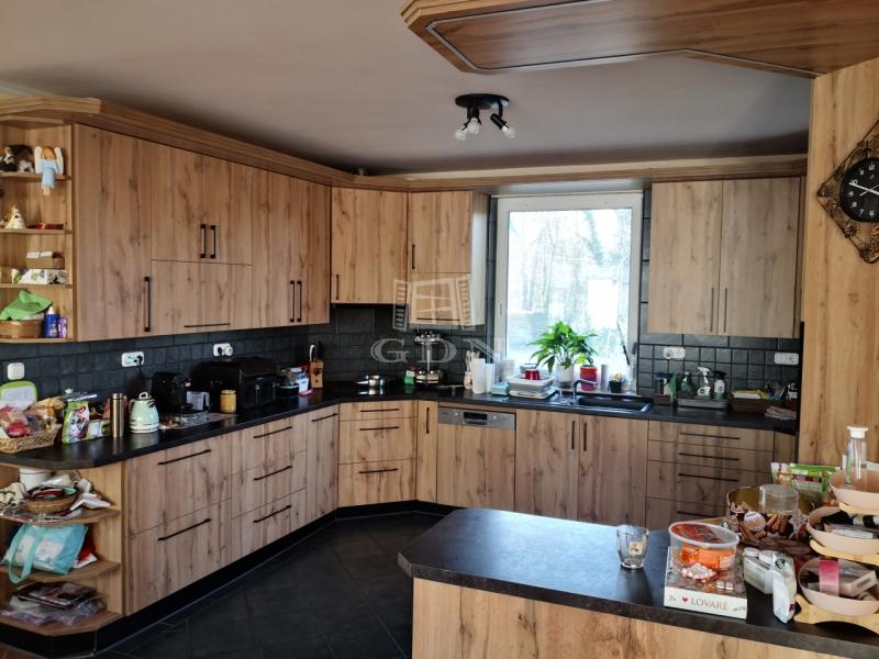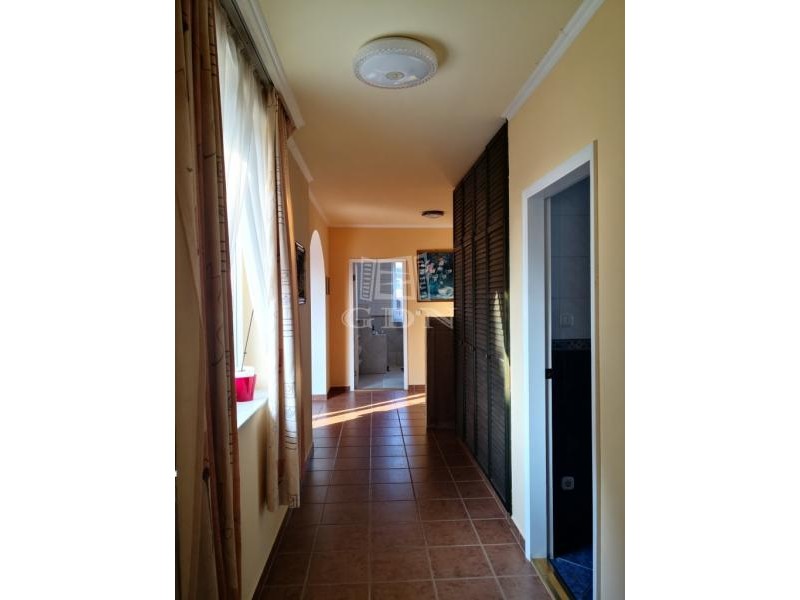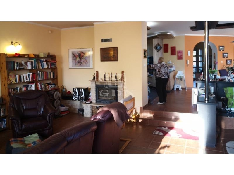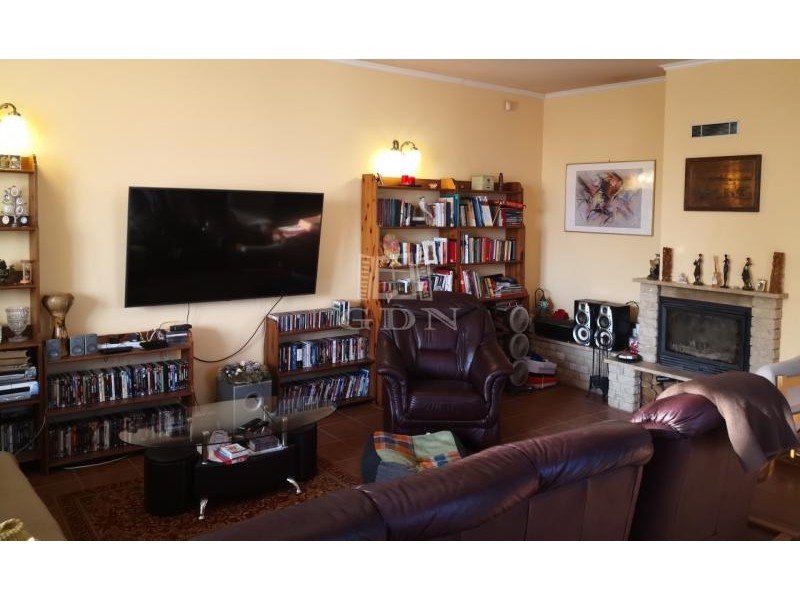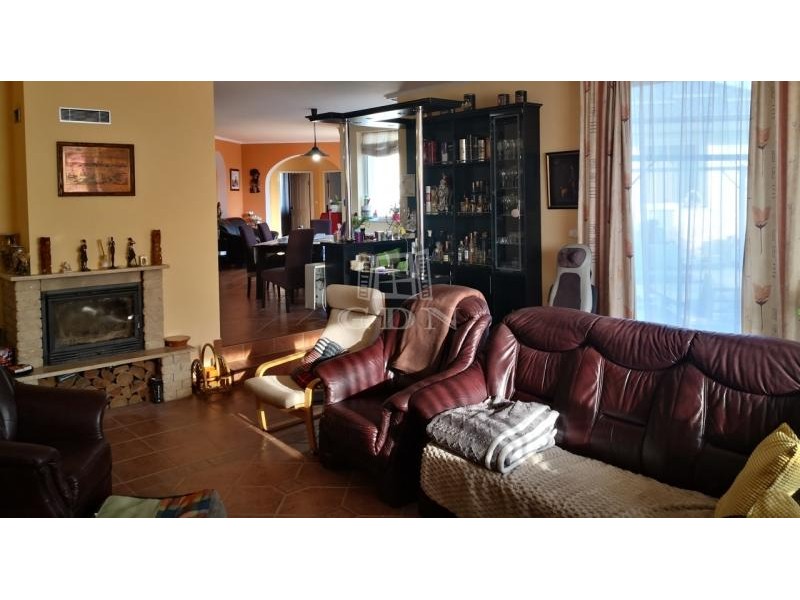 Az épület kert felőli részén nagy méretű, 70 nm-es déli tájolású hangulatos panorámás terasz van kialakítva, melynek egyik oldalán helyezkedik el a nappali, konyha, étkező, a másik oldalán pedig 3 hálószoba, gardrób 2 fürdőszoba és a WC. Az ablakok úgy helyezkednek el, hogy bárhol is vagyunk a házban, mindenhonnan látható a kert és a saját 150 nm-es halas tó.