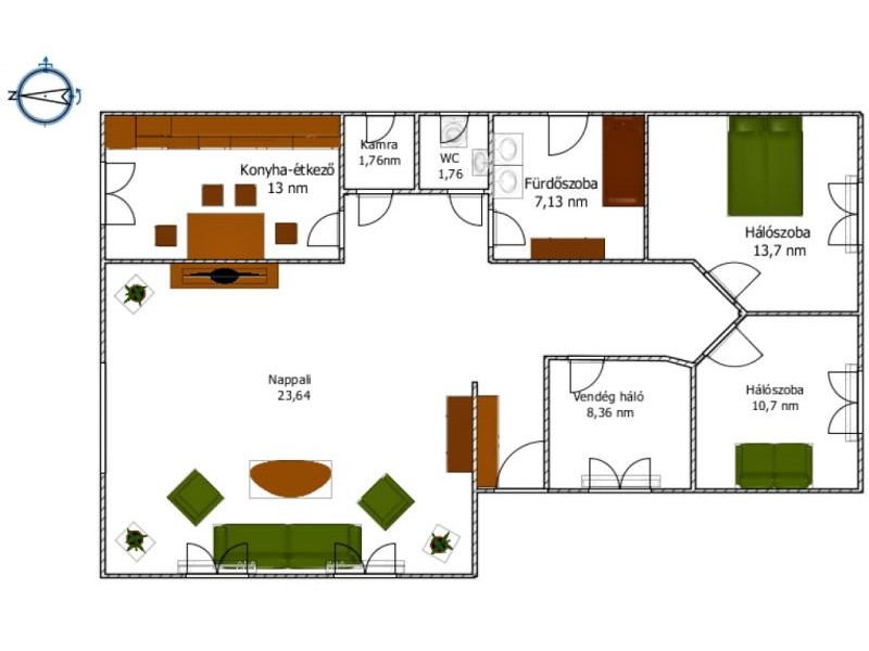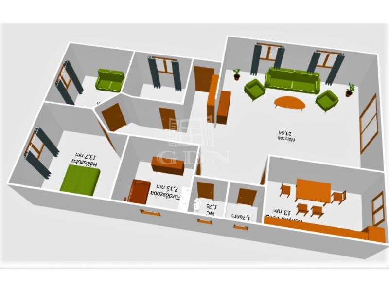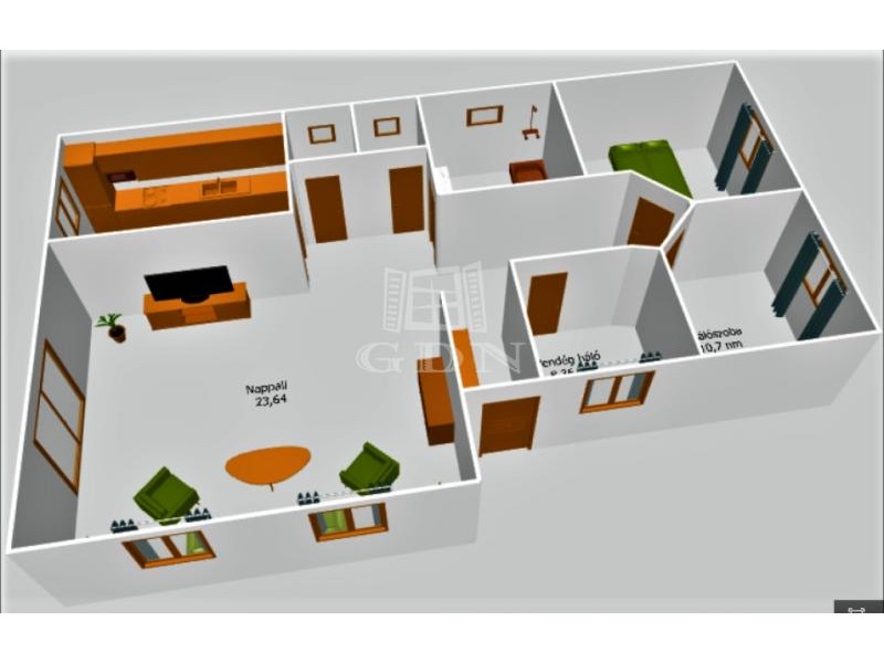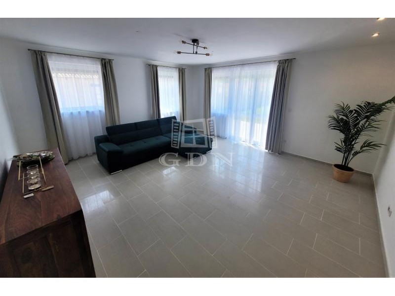 - belső elosztás: nappali, konyha (vadonatúj háztartási gépekkel felszerelt), fürdőszoba, WC, háztartási helyiség, 3 hálószoba, közvetlen kertkapcsolatos nagy terasz,