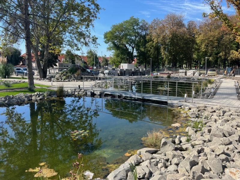 A sétánnyal körülvett, este hangulatvilágítással megvilágított tó a zárt park középpontja, ahol a lakók kellemes környezetben kapcsolódhatnak ki.