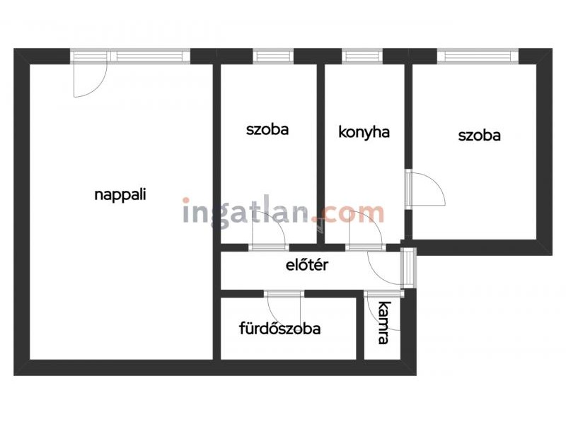 nappali 21,3 m2, előszoba 3,81 m2, szoba 6,45 m2, szoba 8,75 m2, fürdőszoba 3,13 m2, kamra 1,18 m2.