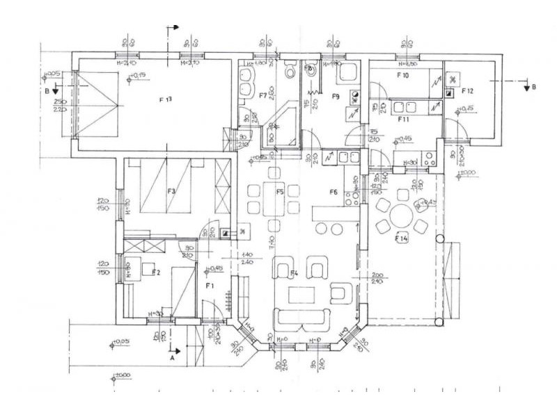 Az otthon helyiségei: előtér 4,20 m2, gardrób 9,00 m2, hálószoba 12,60 m2, nappali 23,00 m2, étkező 14,15 m2, konyha 11,80 m2, kamra 3,00 m2, közlekedő 1,44 m2, fürdőszoba 6,24 m2, Háztartási helyiség 5,98 m2 garázs 21,60 m2, nyári konyha 6,00 m2, kazánház 10,00 m2, tároló 10,52 m2, fedett terasz 18,60 m2