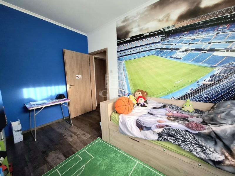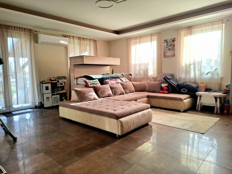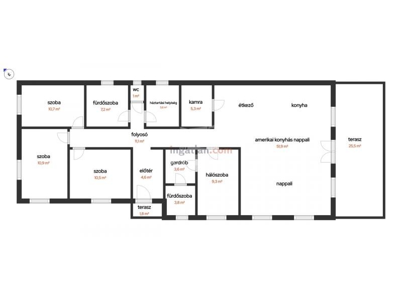 Helyiségei: Előtér 4,6 nm, amerikaikonyhás nappali teraszkapcsolattal 51,9 nm (fedett terasz 25,5 nm), 4 lakószoba egyenként 9,3 nm, 10,5 nm, 10,5 nm, 10,9 nm, fürdőszoba káddal zuhannyal 7,2 nm, fürdőszoba zuhanyzóval 3,8 nm, mosókonyha 5,6 nm, gardrob 3,6 nm, közlekedő 11,1 nm, kamra 5,3 nm, wc 1.1 nm.