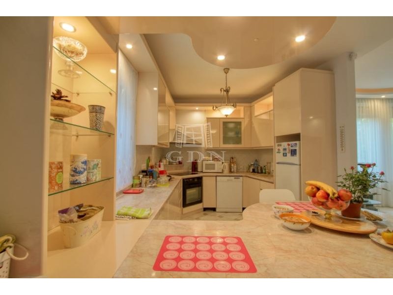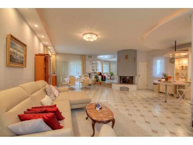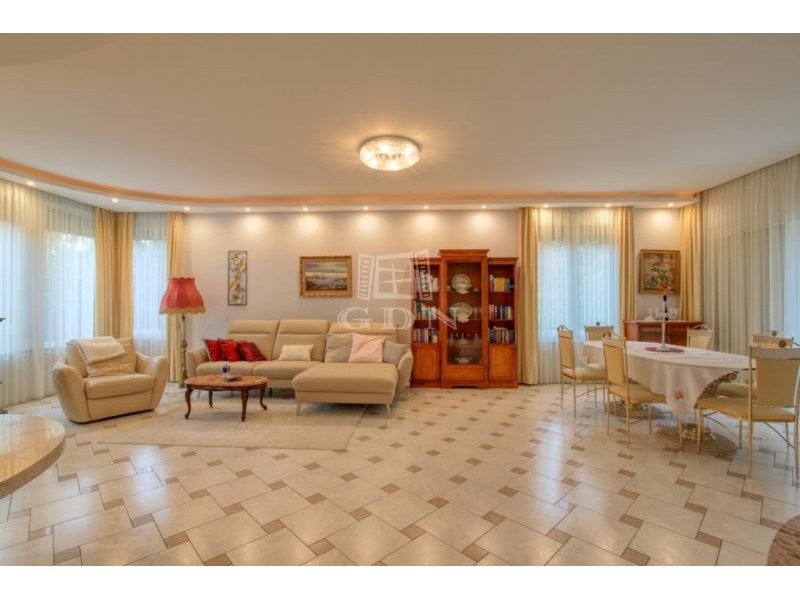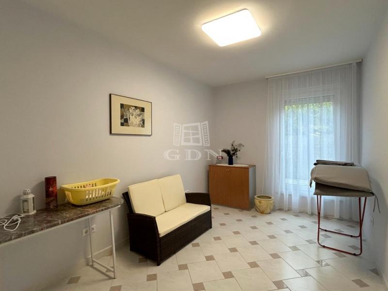 A földszinti lakótérbe lépve az előszobából nyílik a ház tágas és világos központi társalgó vagy étkező helyisége, kilátással a kertre, teraszra és medence térre. Bal oldalon található a hangulatos kandallóval rendelkező, 50 m2-es nappali és 7 m2-es konyha egy légtérben. Jobb oldali irányban találjuk az emeletre vezető lépcsőt, mosókonyhát, illetve egy ajtón keresztül átjuthatunk a külön bejárattal is rendelkező lakásba. Az előszobából nyílik egy vendég WC, a konyhához 2,4 m2-es kamra helyiség kapcsolódik.