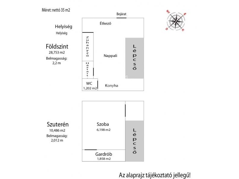 Az ingatlan két szintes, a felső szint 28,753 m2, és alatta található még egy szuterén (10,486 m2) helyiség, megosztva, jelenleg szoba és egy gardrób.