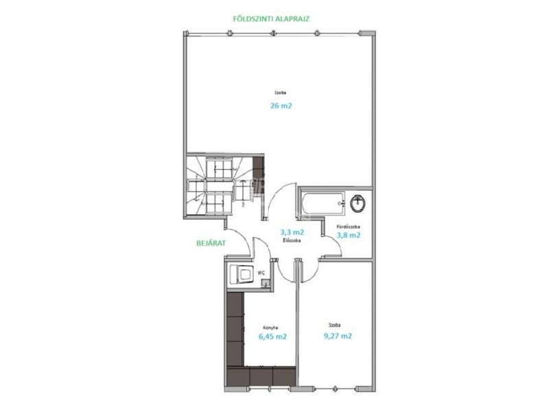 Az alsó szint központja a tágas, 26 m2-es nappali-étkező. Az előtérből nyílik a külön konyha – amely egy kisebb étkezősaroknak is helyet ad –, valamint egy hálószoba, egy fürdő és egy külön WC.