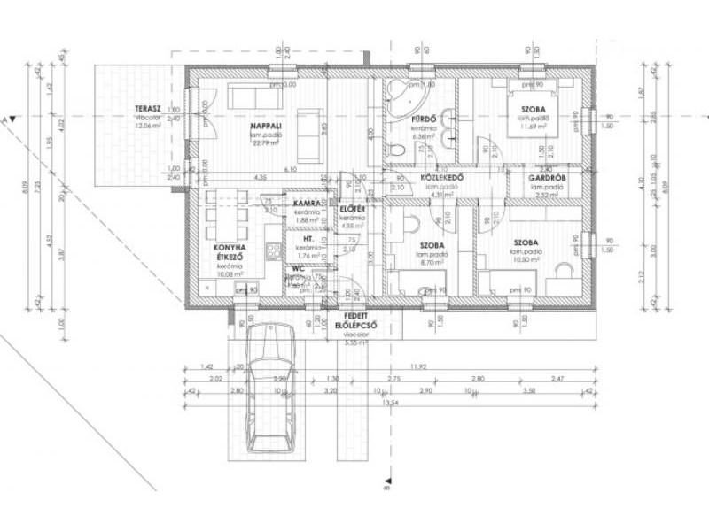 The cold and warm tiling, the windows (size, shape), the front door are optional, the colouring of the house and the fence can be completely customized. The internal partition walls can be moved during the construction.