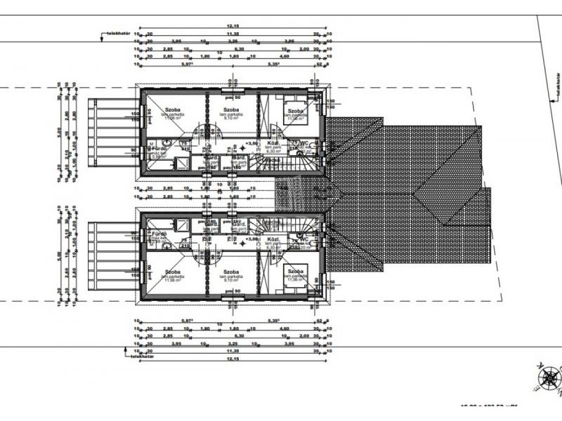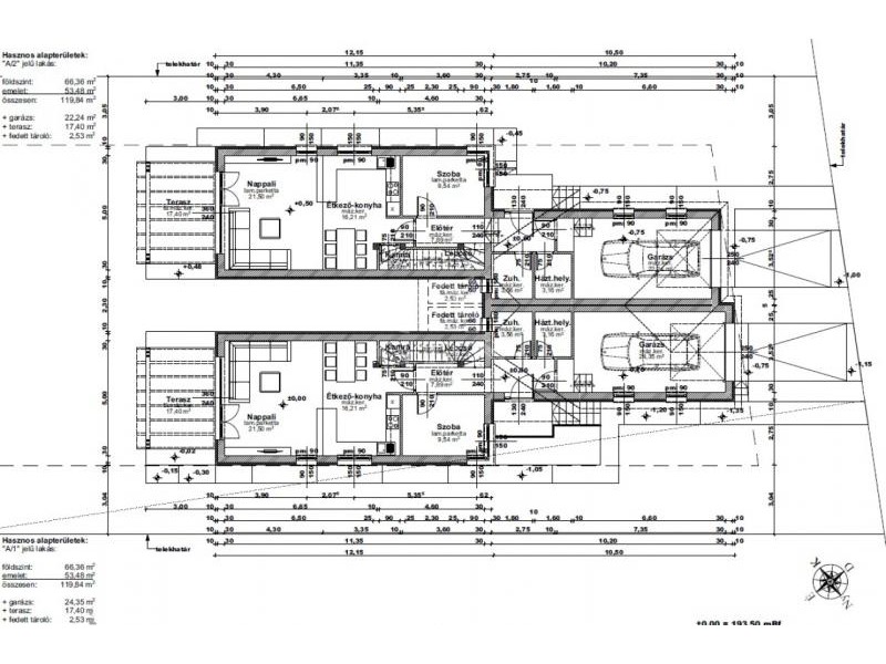 Mindkét ikerház fél nettó 120 nm hasznos alapterületű két szintes épület + mindegyikhez tartozik egy-egy garázs és tároló. A házrészek itt kapcsolódnak egymáshoz.