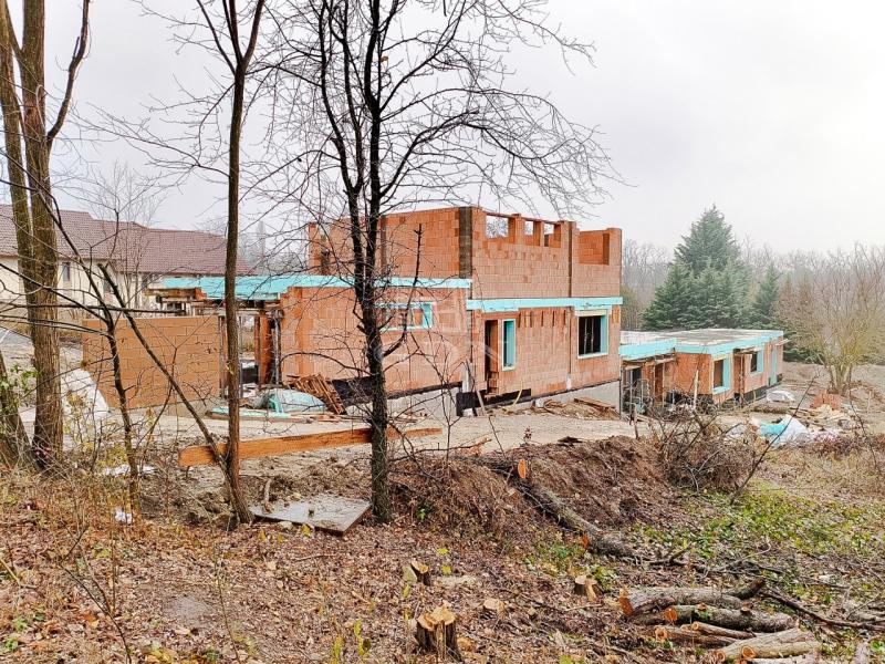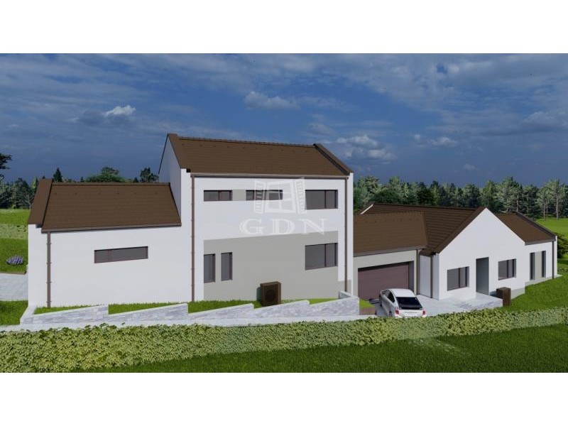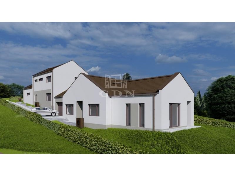 Veresegyház, Hegyek városrész csendes, kertvárosias részén, cca. 650 nm-es telek területtel, Új építésű, bruttó 176 nm-es, 5 szobás (nappali + 4 hálószoba, külön konyha, étkező), egy szintes, vasbeton födémes, hőszivattyús (levegő - vízes) padló fűtéssel, Dél - Nyugati fekvésű, műanyag thermo dió színű (3 rétegű, 7 légkamrás) nyílászárós, szigetelt (15 cm dryvit), új építésű, a másik féltől teljesen elszaparált, dupla garázzsal elválasztott, a másik lakóegységgel egy telken lévő, de külön, elválasztott úton megközelíthető családi ház (hátsó) eladó.
