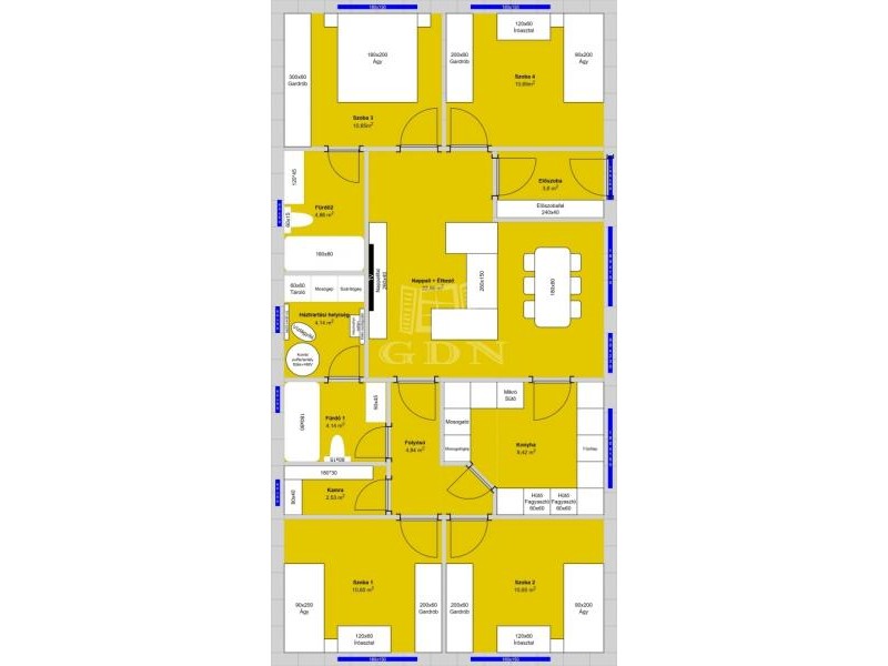 Tervezett elosztás: 4 hálószoba, amerikai konyhás nappali, 2 fürdőszoba, ablakos kamra
