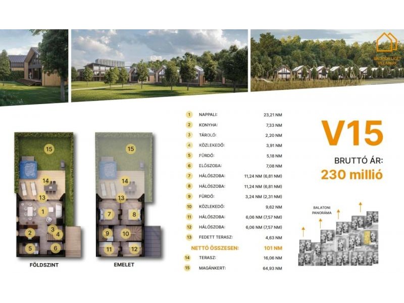 Balatonföldvár: Balatonföldvár fontos turisztikai célpont, nemcsak a magyarok, hanem más európai országok turistái számára is, természeti szépségei (például a löszhegy és a nagy virágos parkok), továbbá történelmi örökségei (például a kelta ösvény, a régi kúriák és villák) miatt számtalan szabadidős lehetőséget, valamint számos vízi sportot (vitorlázás, szörfözés, horgászat, evezés) Villák - kulcsrakész alapfelszereltség: 100% tömör CLT Ausztriából. 20 cm kőzetgyapot hőszigetelés. A+ energetikai besorolás. Fa hőszigetelő nyílászárók 3 rétegű üvegezéssel, tölgyfurnér melegburkolat. Porcelán greslap hidegburkolat. Villeroy fürdőszoba szaniterek,padlófűtés. Levegős hőszivattyú (VRV splitklíma), 2,5 kW napelem rendszer, elektromos redőny, szúnyogháló, beépített bútorok, homlokzati díszvilágítás. min. 26 m² terasz min. 62 m² magánkert. Villák - választható opciók: Prémium konyhabútor konyhaszigettel, okosotthon rendszer, szauna (épületen belül), látvány design kandalló, 4 személyes prémium jacuzzi, gázos grillsütő. Privát zárt parkoló: 6.350.000. Ft. Privát elektromos autótöltő, kedvezményes hajóhely az új e-kikötőben. V.15. A további kérdésekkel és a megtekintéssel kapcsolatban kérem keressen a megadott mobil számon.