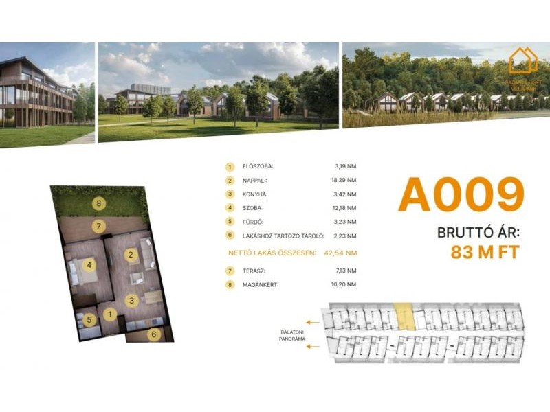 Balatonföldvár: Balatonföldvár fontos turisztikai célpont, nemcsak a magyarok, hanem más európai országok turistái számára is, természeti szépségei (például a löszhegy és a nagy virágos parkok), továbbá történelmi örökségei (például a kelta ösvény, a régi kúriák és villák) miatt számtalan szabadidős lehetőséget, valamint számos vízi sportot (vitorlázás, szörfözés, horgászat, evezés) Balaton liget willapark: Lakások száma: 56 db. Alapterület: 28-56 m². A földszinti lakásokhoz saját, privát kert tartozik. A földszinten 21 lakás található, 48–110 m² közötti alapterülettel. Az első emeleten további 21 lakás érhető el, 47–75 m² közötti méretben. A második emeleten 17 lakás kapott helyet. A lakásokhoz önálló tárolóhelyiségek tartoznak, amelyek a közös folyosóról közelíthetők meg. Környezettudatos építő anyagok A+ energetikai besorolás Felszíni parkoló: 6.350.000. Ft. Modern letisztult építészet, tömegformálás, Balatonra tájolt panorámás teraszok. Apartmanlakás - alapfelszereltség: 100% tömör CLT Ausztriából. 20 cm kőzetgyapot hőszigetelés. Fa hőszigetelő nyílászárók 3 rétegű üvegezéssel,tölgyfurnér melegburkolat. Porcelán greslap hidegburkolat, villeroy fürdőszoba szaniterek padlófűtés. Levegős hőszivattyú (VRV splitklíma), 50kW társasházi napelemrendszer, elektromos redőny, szúnyogháló beépített bútorok saját terasz. A 009. lakás. A további kérdésekkel és a megtekintéssel kapcsolatban kérem keressen a megadott mobil számon.