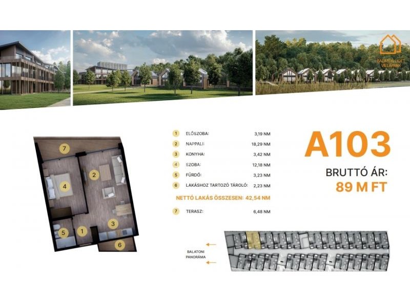 Az első emeleten további 21 lakás érhető el, 47–75 m² közötti méretben.
