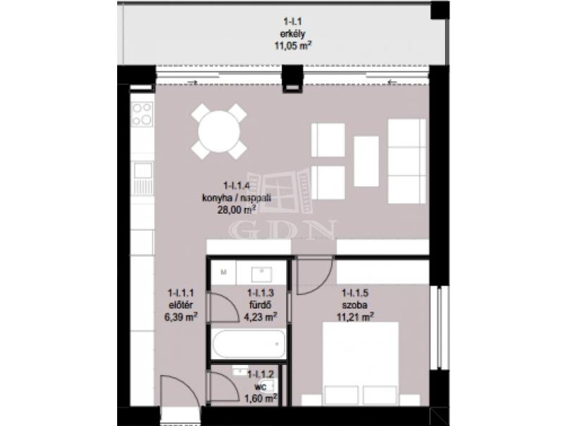 A LAKÁS az első emeleten található. 51 nm lakótér, 11 nm terasz. Amerikai konyhás nappali, hálószoba, fürdőszoba, WC.