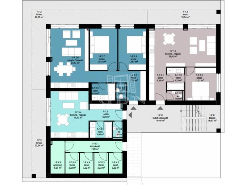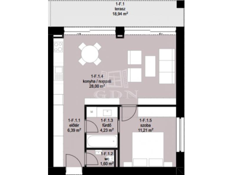 A LAKÁS a földszinten található. 51 nm lakótér, 19 nm terasz, kertkapcsolat. Amerikai konyhás nappali, hálószoba, közlekedő/gardrób, fürdőszoba, WC.