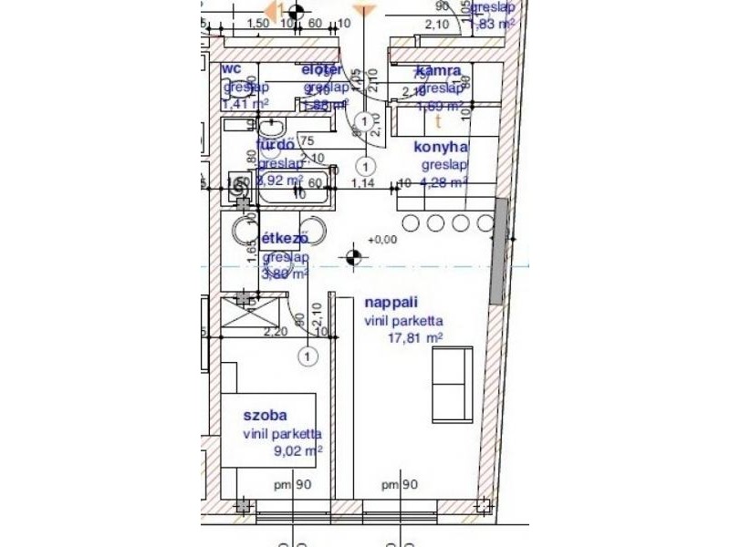 A lakás a tervek alapján konyha, étkező, nappali, szoba, kamra, fürdőszoba, mellékhelyiség, és előtér térfelosztású.
