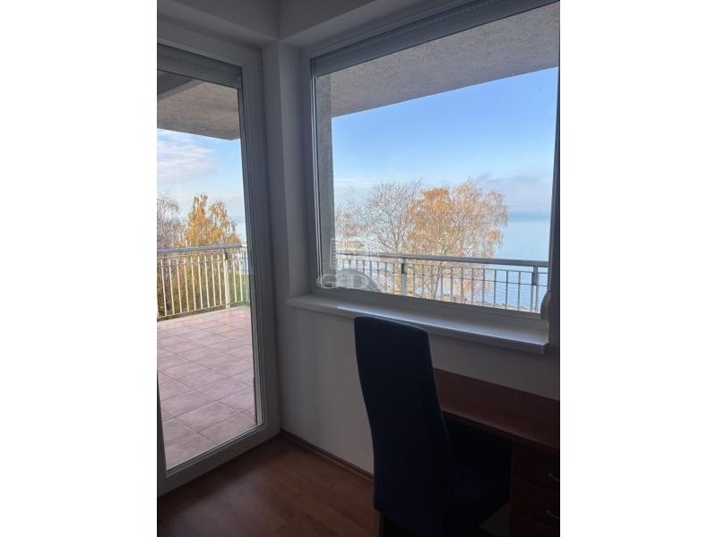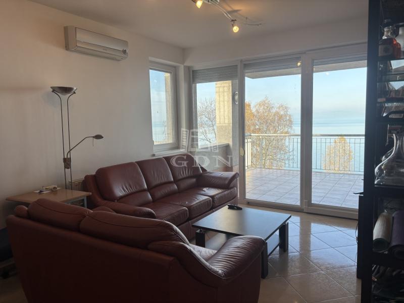 A 16 nm-es terasz fedett, örök panorámás a Balatonra.