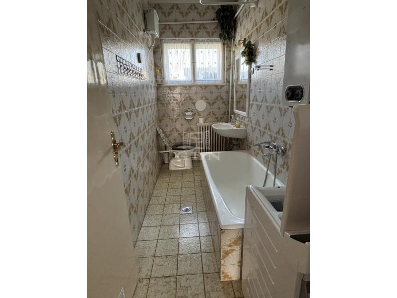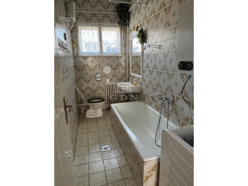 Fürdőszoba káddal, mosdóval, vécével.
