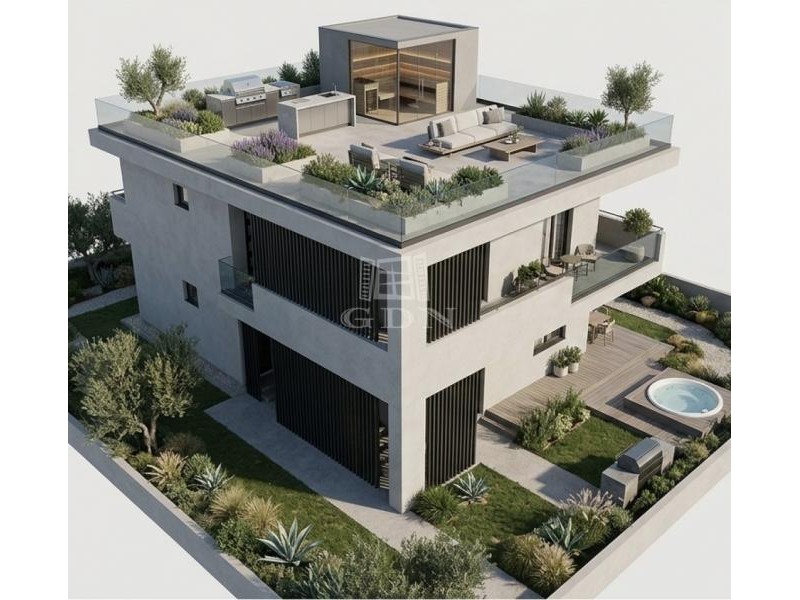 nettó alapterülete 98 nm + 57 nm + 120 nm privát tetőterasz + 200 nm saját kertrész.