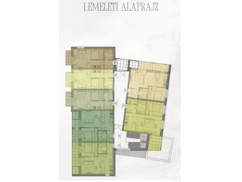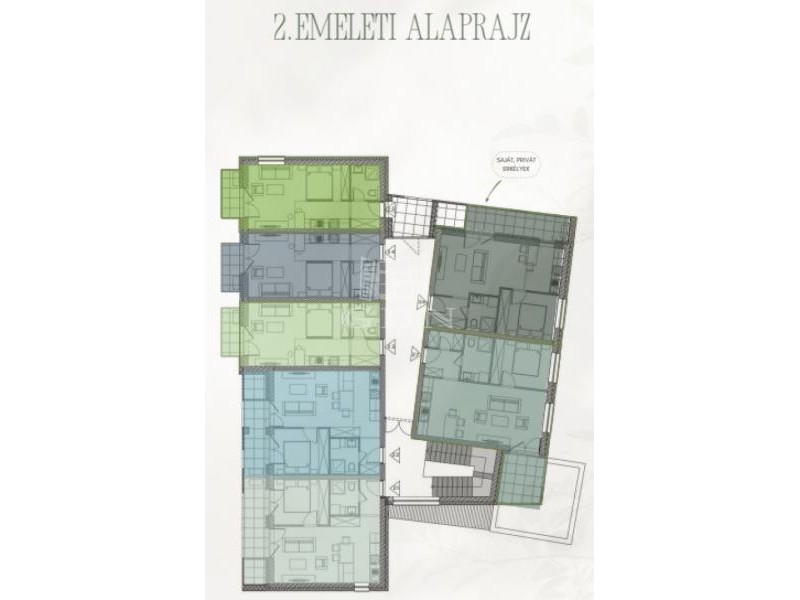 A 3 szintes lakóépület földszintjén, illetve első és második emeletén további lakások helyezkednek el, melyek 29, 30, 39, 40 és 46 m2 alapterületűek.