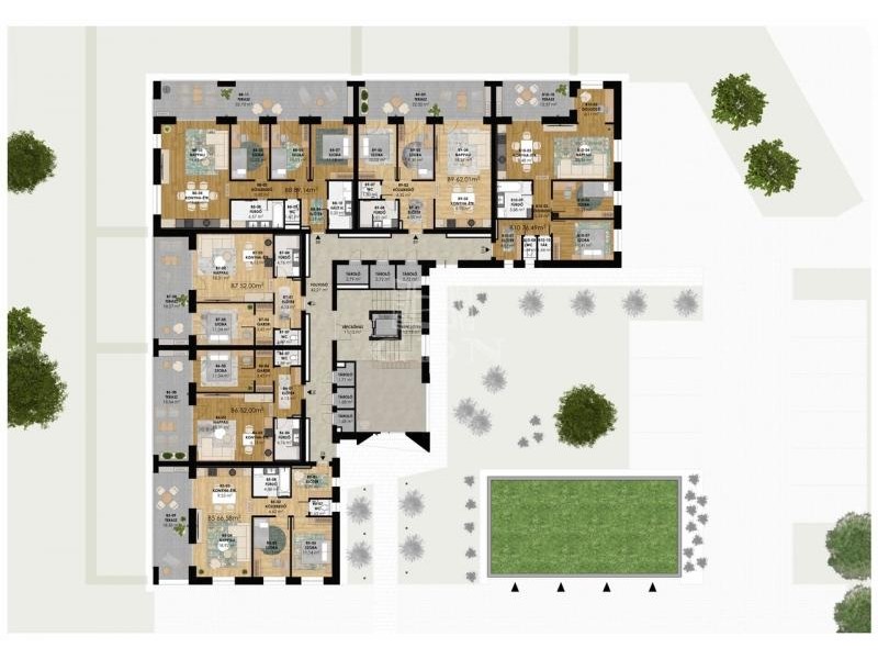 Modern megjelenésű, értékálló, kényelmes és élhető lakóparkban valamint az épületekhez kapcsolódó egyedi lakókörnyezetben szeretne élni? Hamarosan megvalósulhat az álma. A Gyöngyös-patak partján belváros közeli prémium lakások épülnek 20 000 m2-es területen, több ütemben. A tervezés során a funkció, a környezettudatosság és a kényelem voltak a legfontosabb tervezési szempontok. Így különösen az épületek szellős elhelyezése, a lakások kedvező tájolása, az épületek körül a maximális zöldterület és a megfelelő garázs szám biztosítása, a színvonalas közösségi funkciók kialakítása. A lakások értékállóságát és kényelmét az átgondolt tervezés, a minőségi anyagok használata, a nagyméretű, intim teraszok, a lift, a megújuló energia, egyedi és közös tárolók, fedett beállók, garázsok biztosítják. Az alkalmazott szerkezetek megfelelnek a ma érvényes “közel nulla energiaigényű épületek” követelményeinek. Az épületek előtti sétányok díszkivilágítást kapnak mozgás- és alkonykapcsolás vezérlésével. A sétányokról különböző típusú gépkocsi beállóhelyek – felszíni fedett, és normál parkolók ill. garázsok - közelíthetők meg. Egyes parkolók között beruházói döntés szerinti helyen és műszaki kialakítással, elektromos töltőpont csatlakozási lehetőség biztosítható. A közös területek alkalmasak játékra, pihenésre, a földszinti lakások előtti kijelölt zöldterület saját használata mellett. A ház kaputelefon rendszerrel lesz felszerelve. A lépcsőházban és egyéb közös terekben légterenként időkapcsolós világítás lesz kiépítve. A mai korszerű követelményeknek, az épületek hő és hangszigetelése a vonatkozó szabályoknak maximálisan megfelel. A külső hőszigetelés vastagsága 16-20 cm. Az ablakok 3 rétegű üvegezéssel kiváló hőszigetelésű nyílászárók. A lakások padlófűtéssel rendelkeznek, mely a szabadabb belsőépítészeti kialakításoknak ad lehetőséget. A tervek szerint a központi gépészet távfelügyeleti rendszerrel ellátott, távfűtés, így a karbantartás és üzemeltetés során ez gyors beavatkozást és üzembiztonságot eredményez. A fogyasztás egyedi mérőkkel mért, az elszámolást a közös képviselő végzi. A megújuló energia tervek szerint a megfelelő energetikai szabályok alapján kerül telepítésre pl. napelemrendszer. (Kiviteli terv során változhat: kondenzációs gázkazán és/vagy hőszivattyú). Belsőépítész által tervezett lakások, nagy teraszokkal kapcsolódnak a természethez. Befektetőknek, nagy családoknak alkalmas lakások kerülnek kialakításra. A kisebb lakások 52 m2, 62 m2, a nagyobb lakások 67 m2, 76 m2 és 89 m2 nagyságúak lesznek. 12-33 m2 fedett intim teraszok kerülnek kialakításra. Aktuális, bevezető ajánlatban az 1db felszíni parkolót, vízlágyító rendszert, klíma előkészítést ajándékba adja a beruházó. A lakásokhoz tárolók, garázsok vásárolhatók. Kimerítőbb tájékoztatást személyesen. A hírdetésben szereplő lakás 1.emelet 9.